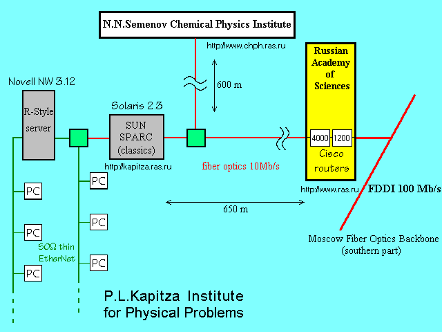 Локальная компьютерная сеть в Институте физических проблем им.П.Л.Капицы Российской академии наук насчитывает немногим более 50 персональных ЭВМ всех типов от 286 до 586, подключенных через 50-омный коаксиальный кабель "тонкий Ethernet" к файл-серверу фирмы "R-Style" с 4.5 Гбайт винчестером и источником бесперебойного питания.